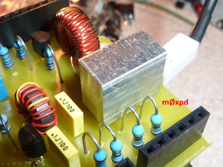 The power stage is simply two 2n3904 transistors which are driven to produce 500mW. This involves dissipating a fair amount of energy in the little transistors - so I treated them to a homebrew heatsink, hewn out of a scrap of Aluminium (apologies to our North American readers for the spelling lesson)...